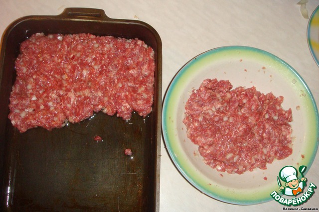 Смазываем противень подсолнечным маслом и выкладываем на него фарш.