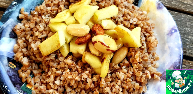 Гречку - на тарелку, яблоки-мёд-орешки - сверху.