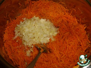 Заливаем наш порезанный лук и чеснок раскаленным маслом и перемешиваем. выкладываем их в морковку и снова тщательно перемешиваем