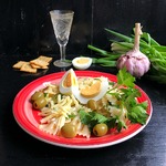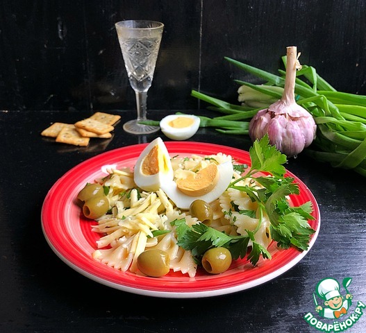Готовила коллега на работе к праздничному столу, необычно и вкусно, основной состав салата мы быстро разгадали, но никто так и не догадался, что там была вермишель... Дома я рецепт немного изменила, по-моему, салат от этого только выиграл. За фото к рецепту спасибо Ольге Демурия.