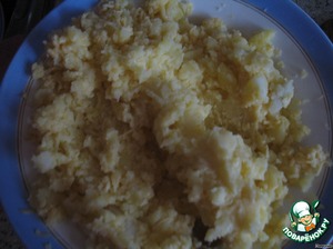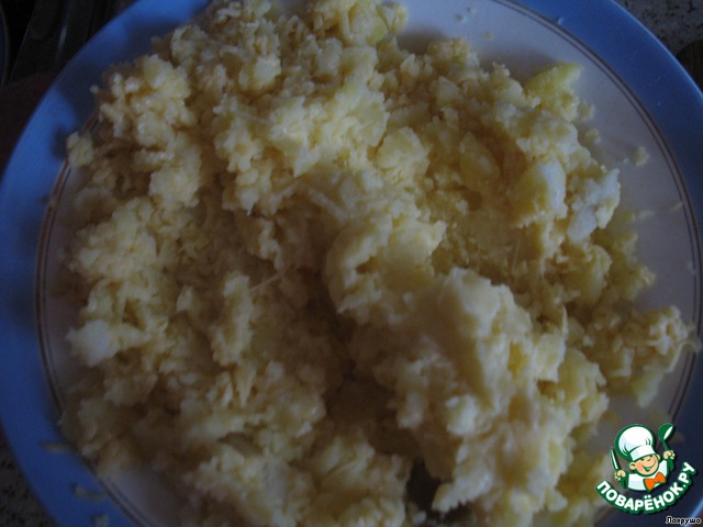Мякоть картошки перемешиваем с чайной ложкой соли, маслом и натертым на терке твердым сыром.