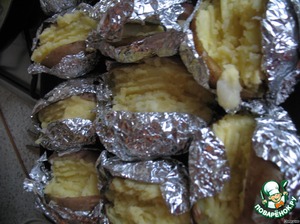 Когда картошка готова, аккуратно (чтоб не обжечься) разрезаем ее на пополам и достаем серединку, складываем в отдельную тарелочку. Получаются вот такие "пустышки".