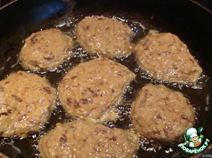 Жарим котлеты на растительном масле. Выкладываем на сковороду столовой ложкой. Т. к. фарш получается густой, то помогаем пальцем снимать фарш с ложки.