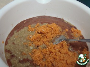 Пропустить через мясорубку (блендер) печень, лук, морковь, чеснок. В готовый фарш добавить отваренный рис. Посолить, поперчить. Добавить муку. Фарш должен получится густым, гуще чем на оладьи.
