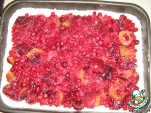 • Приготовим начинку: если сливы кисловатые, добавим немного сахара, если большие - порежем на дольки. Я взяла больше слив, чем в рецепте (вообще в пироги и в салаты продукты кладу на глаз), добавила к сливам еще красную смородину и бруснику (для эксперимента). Получилось очень-очень вкусно и сочно. Из одних слив тоже получается безумно вкусно. Только не переложите начинки, а то пирог придется есть ложкой. Хотя так еще вкуснее...