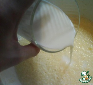 Засыпать муку и разрыхлитель. Если сода, то погасить.