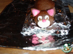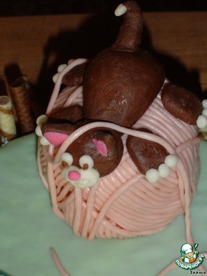Делаем мордашку из коричневой мастики и белой так, как показано на фото. Носик лепим из розовой мастики и клеим на белую часть мордочки. Из маленьких кусочков белой мастики делаем глазки, а из коричневой - зрачки. Зрачки можно сделать и из зеленой мастики.