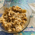 Фарш обжарился - размяли его вилочкой, чтобы не было больших комочков, добавили рис, залили заливкой. Заливка должна закрыть рис. Пусть теперь покипит (на слабом огне) минут 5 -7.