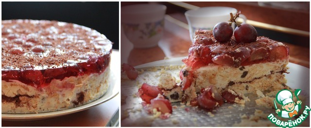 Достаем торт из холодильника, красиво выкладываем на него половинки винограда.