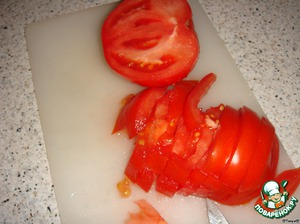 Добавить помидоры, нарезанные соломкой, и сахар. |