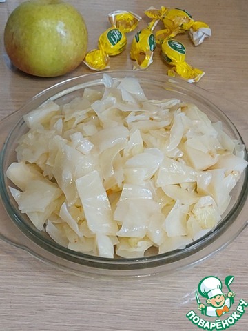 Достаем нашу капусту из рассола, режем на крупные кубики.