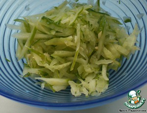 Огурец очистить от кожуры, натереть на терке тонкими полосками.