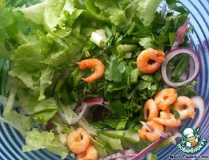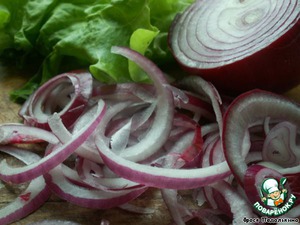 Салат порвать руками на кусочки, зелень порезать. Лук нарезать полукольцами.