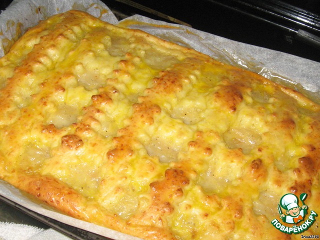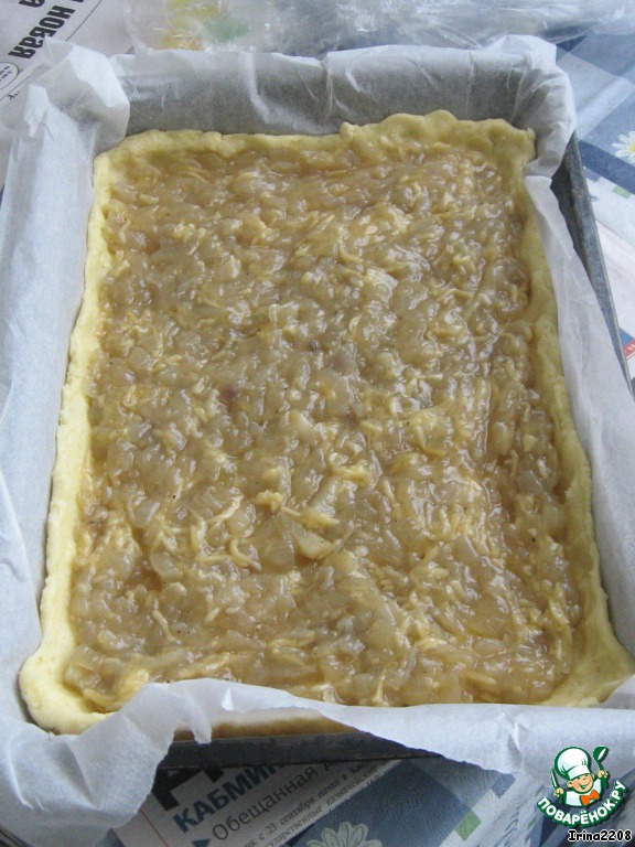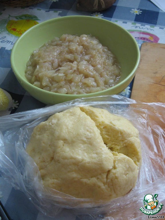 Тесто я делала за сутки до приготовления. Все просто - творог, 1 яйцо, масло, соду, соль (1 ч. л.) и муку смешать до консистенции не липнущего эластичного теста и отправить в холодильник. Лук (на следующий день) порезать квадратиками и тушить на сковороде под крышкой до кремовой консистенции на маленьком огне (это примерно минут 40-50, смотрите, чтоб не подгорело). В конце добавить соль и чесночный перец