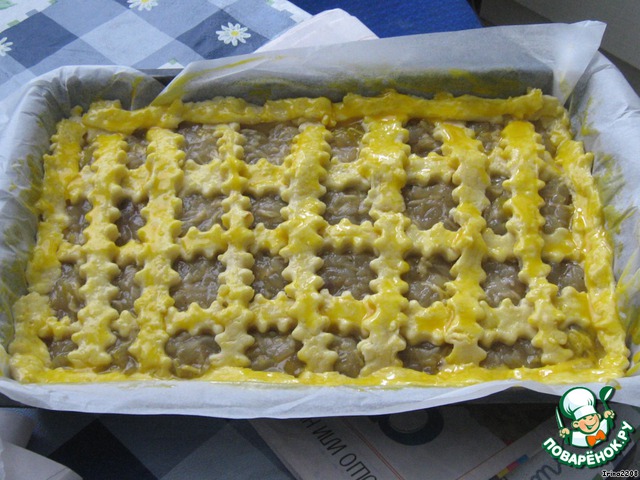 Из остатка теста сделать решетку, выложить ее на пирог и смазать верх желтком