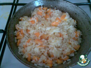 Обжарить 1 луковичку и морковку, нарезанную кусочками и смешать с варёным рисом.
