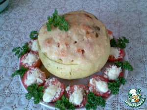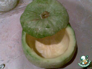 У небольшой тыквы срезать верхушку,почистить от семян и снять немного мякоти.Поставить в разогретую духовку в сковороде,с добавлением 0,5 ст. воды, вверх дном на 30 минут.