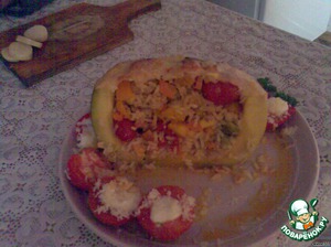 Вынуть тыкву(духовку не выключать), слегка охладить, обмазать сверху и внутри растительным маслом, положить в неё рисово-овощную смесь и поставить в духовку на 2 часа.Можно тыкву накрыть верхней частью с череночком, но у меня получилось многовато овощей и я накрывать не стала.