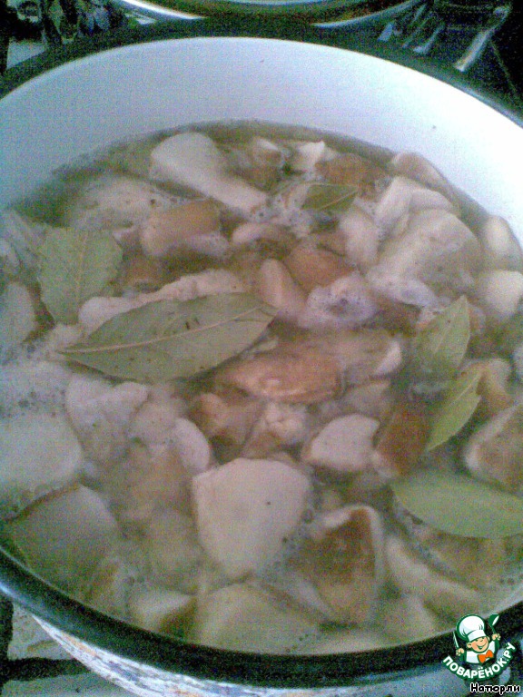 Воду слить, промыть грибы, снова залить водой и бросить в грибы соль, перец и уксус, еще лаврушку, варить еще 20 мин.