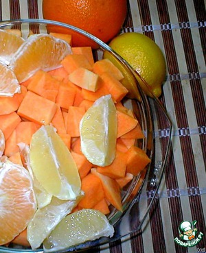 Тыкву, апельсин и лимон очистить от кожицы, апельсин и лимон от зерен. Провернуть все через мясорубку.