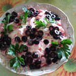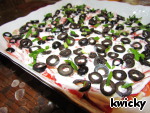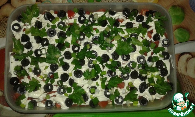 На помидоры выкладываем кружочки маслинок. Хорошо бы украсить зеленью, но у меня к сожалению не нашлось, только немножко укропа.
