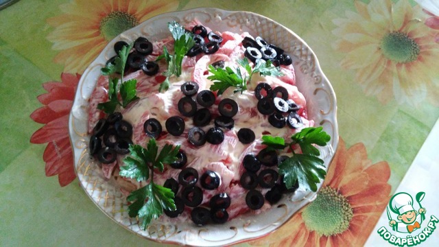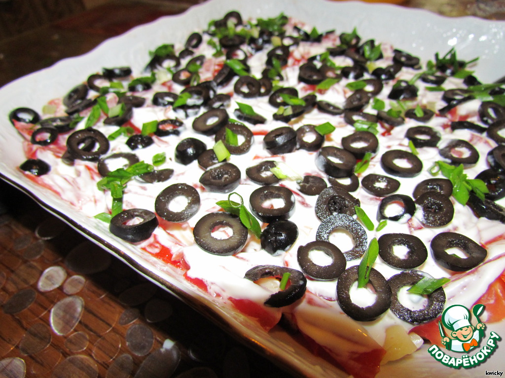Рецепт этого обАлденно вкусного салата подсмотрела в одном журнале. Попробовала раз, и теперь без него не представляю праздника. По-моему, идеальное сочетание простых продуктов, оригинальная нарезка (как для слоеного салата), просто подкупает! Попробуйте, гарантирую, сделав один раз, отказаться от него не сможете!