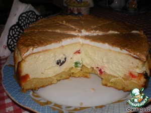 Пока печётся наше тесто, подготавливаем начинку.Творог взбиваем с сахаром и желтками,постепенно, вмешиваем манку,сметану и смесь орехов,цукатов и изюма.