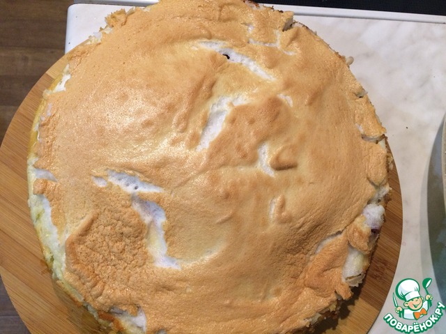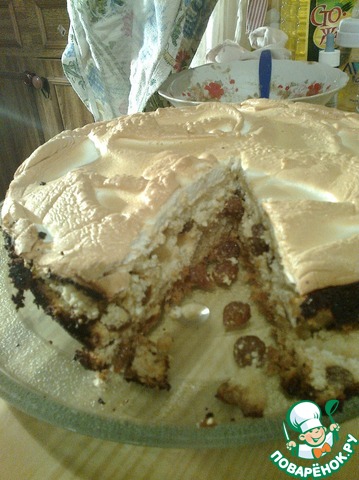 Взбиваем охлаждённые белки с сахаром.Вынимаем ватрушку из духовки через 30 минут и выкладываем на творожную начинку взбитые белки.