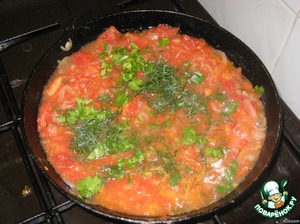 На растительном масле обжариваем лук в течении 3-5 минут, добавляем мелко нарезанные помидоры и жарим еще минут 7, затем выжимаем чеснок, посыпаем зеленью и отставляем.Даем остыть.