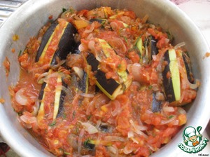 В сделанный надрез в баклажане мы немного вкладываем тушенные овощи и складываем в посуду для запекания, остальное выкладываем сверху. Накрываем все фольгой и в