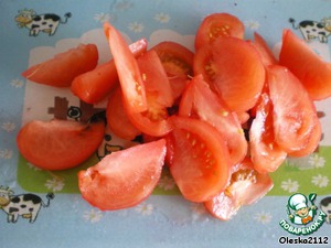 Через 2-3 минуты, помидоры выкладываем в холодную воду и снимаем кожицу. Нарезаем дольками (можно кубиками).