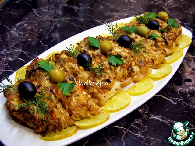 P. S. Лука и грибов должно быть в соотношении 1 :1 то есть сколько лука, столько и грибов! В моем рецепте не указаны соотношения так как я все делаю как говориться на глаз! Приношу свои искренние извинения! На каждый кусочек рыбы от одной до двух столовых ложек начинки!