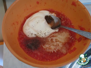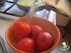 Помидоры обдать кипятком. Снять шкурку и натереть на терке. Откинуть на сито, чтобы стекла водичка.