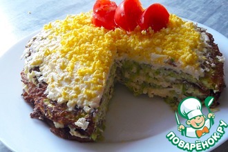 Берем готовый блин, смазываем его томатно-майонезным соусом. Посыпаем тертым (на мелкой терке) сыром. Потом рубленной зеленью. Потом следующий блин... и все повторяем.