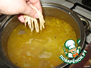 Когда лапша нарезана, бросаем её в кипящий бульон.