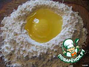 Высыпаем кучкой на доску. Делаем в центре углубление и разбиваем туда одно яйцо.