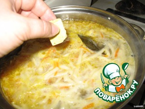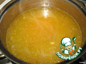 Добавляем в бульон получившуюся зажарку и только посмотрите - наш бульон сразу приобретает красивый золотистый цвет!
