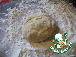 Добавляем 1 стол. ложку воды и щепотку соли. Замешиваем крутое тесто. Тесто должно получится как для пельменей. Даём ему постоять несколько минут.