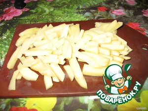 Картофель нарезаем брусочками. (Картошки нужно совсем немного. У нас же лапша, а не картофельный суп!)