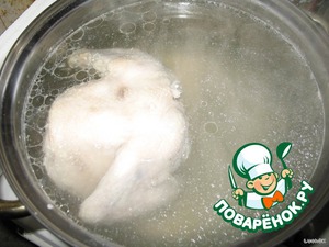 Варим куриный бульон. Почаще снимаем пену и следим, чтобы бульон сильно не раскипелся, иначе будет мутным и непривлекательным
