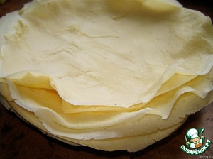 Жарим на сковороде тонкие блинчики. Сильно не зажаривайте, пусть останутся светлыми. У меня вышло 12 шт.