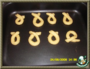 Разогреть духовку до 180 градусов. Тесто еще раз промесить, разделить на 4 части, каждую раскатать в виде длинного тонкого валика, диаметром примерно 1 см, нарезать кусочки по 20 см. Должно получится 32 штуки. Свернуть их кренделем, выложить на бумагу для выпекания и отправить в духовку на 10-15 минут.