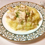 Сверху выложить куриное мясо. Сверху полить соусом что остался в сковороде. Еще немного посолить и поперчить на ваше усмотрение. Выпекать в духовке 30-45 минут. (написано было сбрызгивать духовку водой каждые 15 мин.) чётко придерживалась писаному ;-)