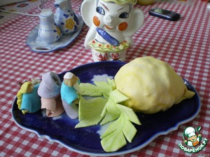 Из мастики подкрашенной в зелёный цвет делаем листья для репки и прикрепляем сахарным сиропом.