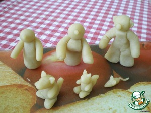 Из цветной мастики вырезаем одежду для наших героев сказки.К сожалению фотографии этого этапа не получились.Для деда нужны:рубашка и штаны,а также борода и волосы.Для бабки- платье и платочек.Внучке делаем волосы и заплетаем косичку и обязательно платье.Жучку покрасила пищевым красителем в коричневый цвет,кошечку -белым шоколадом растопленным и придала "пушистость",мышка осталась марципанового цвета.