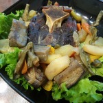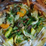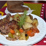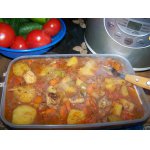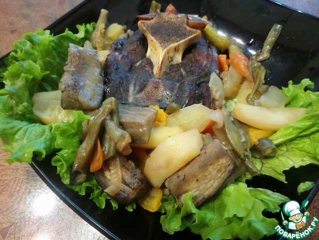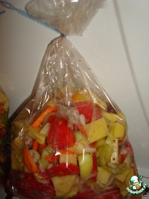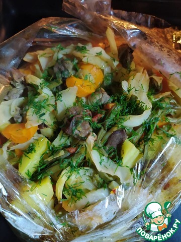 , что есть в холодильнике), чеснок, мясо баранину или говядину - кусочками. Далее солим, перчим, кладем зиру, кинзу или любые приправу для мяса. Также можно добавить чуть-чуть белого вина. Все перемешать и пусть постоит 1 час. Для диеты или постного меню можно мясо не класть. Положить все в рукав, выпустить воздух (чтобы пакет не лопнул при расширении воздуха), закрыть и в духовку на 1,5 часа на 170 градусов (будет с бульоном) или 180-190 градусов (будет суховато). После готовности разрезать пакет, выложить, и сверху посыпать свежей зеленью. Пальчики оближешь. (забыла сфотографировать окончательный вариант)