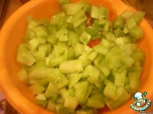 Тщательно вымыть и обрезать помидоры. Нарезать кубиками.