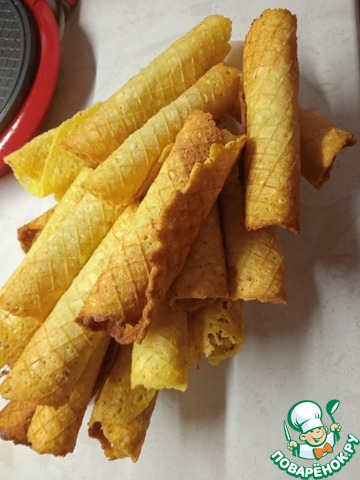 Когда испечется, снимаем и быстренько, пока вафли горячие, сворачиваем. Приятного аппетита!!!