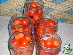 Небольшие помидоры проколоть в нескольких местах деревянной зубочисткой, разложить по банкам.