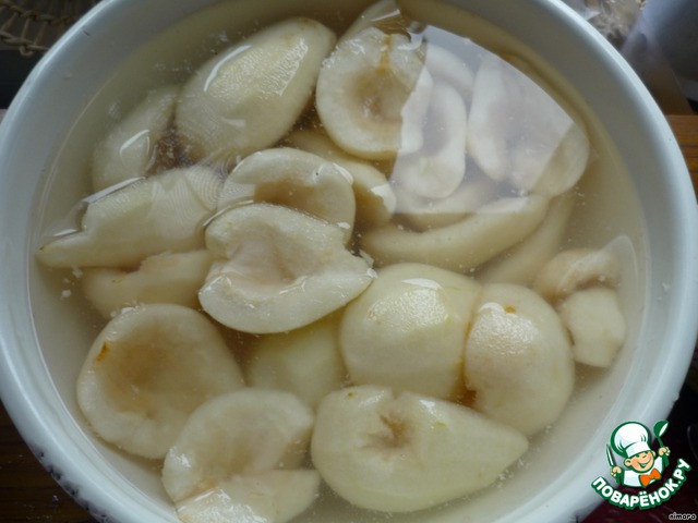 Груши вымыть, очистить от кожуры и плодоножки, разрезать вдоль пополам, вынуть середину. В принципе можно не чистить кожуру. Для того, чтобы они не потемнели нужно их положить в раствор лимонной кислоты (0,5 ч. л. на 1л воды). На огонь поставить миску с раствором лимонной кислоты (0,5 ч. л. на 1 л воды), довести до кипения и огонь свести на минимум, переложить туда груши и выдержать 15 минут (кипеть с грушами не должно!!!). Затем груши переложить в холодную воду с лимонной кислотой (это третья миска с лимонным раствором).